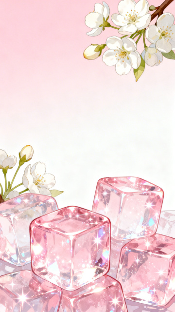 梦幻粉嫩渐变背景,樱花枝点缀,玻璃质感冰块晶莹剔透,星光闪烁,插画风轻拟物设计,营造浪漫清甜春日氛围。