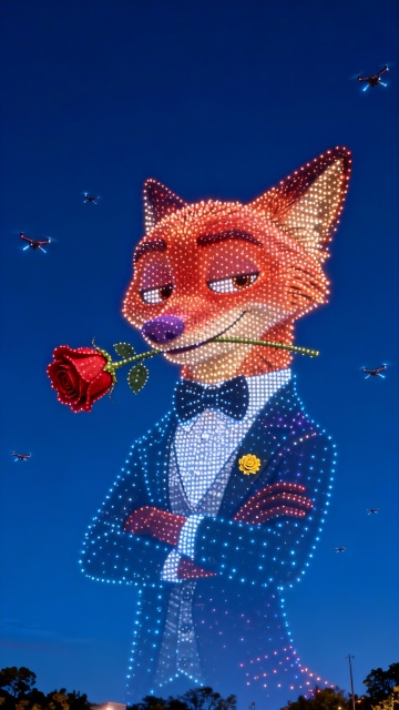 无人机灯光秀,中心区域浮现由无数渐变光点组成的图示人物,形象还原,光点简洁,深夜蓝色天空背景。周围有无人机点缀。