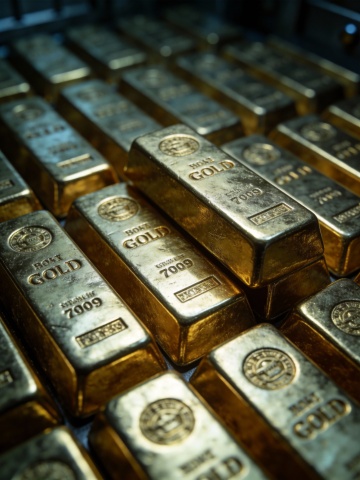 3D渲染风格,大量悬浮与堆叠的金色金条,金条表面有精细的压印纹理和点状装饰,整体呈现出极高的金属光泽感与反光效果,明亮的顶部光源照射下形成清晰的高光与柔和阴影,金色为主色调且色彩和谐统一,营造出奢华、贵重且充满动感的氛围,金条以不同角度和姿态分布,构图饱满且富有层次感,画面中无任何文字、LOGO及二维码元素。