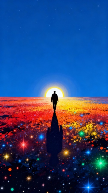 无人机灯光秀,中心区域浮现由无数渐变光点组成的图示人物,形象还原,光点简洁,深夜蓝色天空背景。周围有无人机点缀。