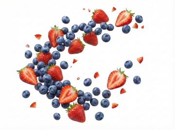 超写实风格的蓝莓背景,深蓝色调为主,点缀水珠的光泽与水花四溅的动态效果,几颗饱满的蓝莓悬浮于半空,底部是盛满蓝莓的玻璃碗,周围环绕着晶莹的水滴和几片翠绿的叶子,背景带有朦胧的光斑,整体营造出清新、水润且富有生命力的氛围,光影层次分明,细节质感细腻,水珠的透明感和蓝莓的紫黑色泽形成鲜明对比,构图饱满且富有动感,适合作为具有自然清新设计感的背景使用。