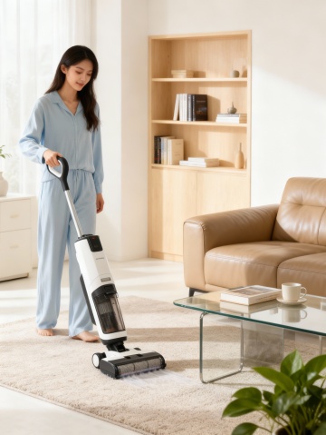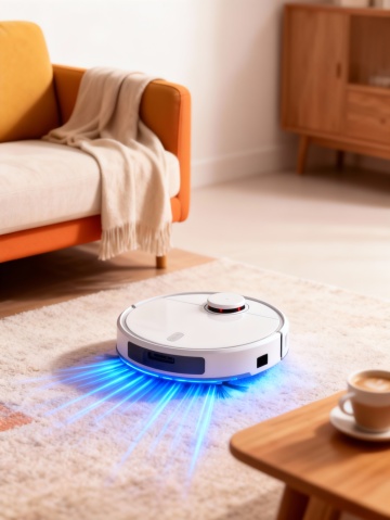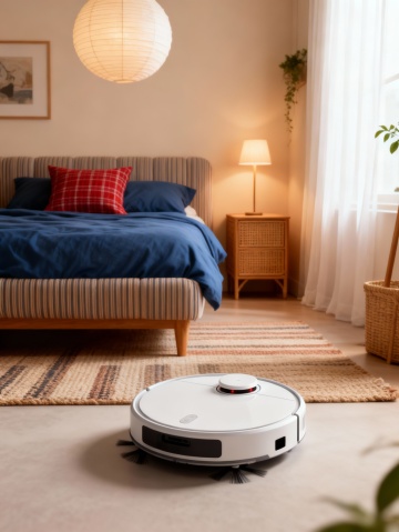 高端产品摄影风格,高清细腻的现代家居渲染质感,整体采用暖棕 + 浅灰 + 黑紫的低饱和暖色调,搭配蓝紫色科技光效;画面为室内近景轻微仰拍视角,采用主体偏右的视觉重心构图,背景做浅景深虚化处理;场景为温馨卧室环境,背景包含浅灰色软包床头、米色抱枕、深灰色床品,左侧置放黑色床头柜,柜上摆放深褐色陶瓷台灯(配米白色灯罩)与灰色小型摆件,墙面挂有植物图案装饰画,左侧辅以浅棕色窗帘;主体呈 45 度倾斜角度摆放于画面偏右区域,占据70%视觉占比,主体被放置在床上蓬松的米白色毛毯上;主体底部、机身处添加蓝紫色动态强吸力光轨特效,各元素围绕主体构建层次分明的居家空间,主体与卧室陈设自然融合,柔和布光同时突出场景温馨感与主体科技质感。