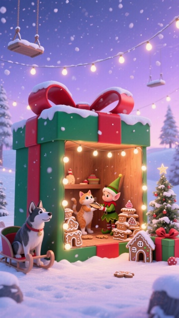 毛绒质感的圣诞树搭配3D微缩艺术风格,卡通化圣诞老人与驯鹿穿梭其间,彩球、礼物堆叠如毛线球,营造出温暖喜庆、趣味十足的节日氛围。