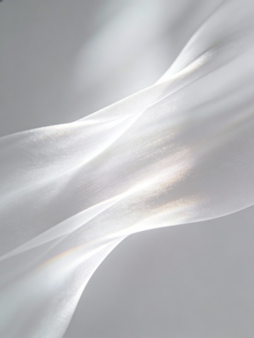 纯净的白色丝绸以优雅灵动的姿态在柔和的白色背景中飘逸舞动,丝绸表面呈现出细腻的珠光光泽和隐约的经纬纹理,光影运用上采用了柔和的侧逆光,在丝绸的褶皱处形成了微妙的明暗对比和细腻的阴影层次,营造出轻盈、纯净、高级的氛围。画面整体采用不对称的动态构图,丝绸从右下角向左上方舒展延伸,形成富有韵律感的视觉引导线,展现出丝绸柔软而富有弹性的质感。