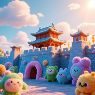 梦幻感十足的软3D风格长城,融合刺绣风与毛发生长质感,可爱卡通小能点缀雪景,节日氛围温馨治愈。