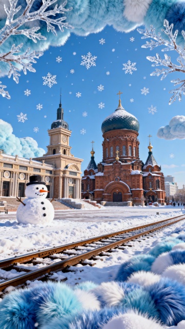 微缩艺术风融合中式建筑与未来都市,雪中刺绣质感的3D城市景观,梦幻科技感交织温馨节日氛围。