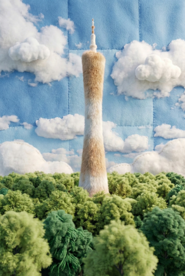 毛茸茸的广州小蛮腰,太阳,海心桥,周边有毛茸茸的建筑,干净的画面,干净的背景,景深,毛毡画,羊毛毡,鲜艳的色彩,童趣,异想天开的,蓬松的,定格动画,微缩景观,有童话的效果