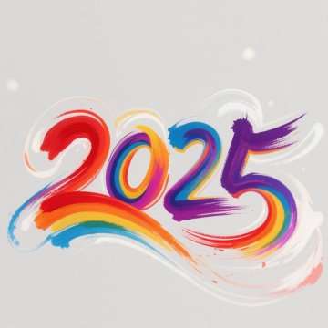 数字艺术风格的“2025”艺术字设计,采用鲜艳流动的彩虹渐变色彩,主要包含红色、橙色、黄色、蓝色和紫色,笔触呈现出富有动感的水彩般透明晕染效果,边缘带有柔和的白色高光和朦胧的虚化处理,整体构图居中,数字之间通过流畅的曲线笔触自然连接,形成充满活力与律动感的视觉效果,背景为纯白色,突出字体的色彩与笔触美感,整体氛围欢快明亮、充满希望与活力。