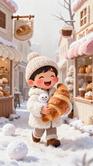 9:16画幅海报,一张温暖治愈的冬日海报,采用中心构图。画面中心是一位穿着蓬松白色羊羔绒外套和针织帽的可爱亚洲小男孩,他脸颊红润,正抱着一个巨大的、毛绒绒的焦糖色牛角面包,开心地笑着。 他身处一个热闹但背景纯净的“纤维艺术小镇”街道。街道两旁是各式由簇绒、毛线编织而成的迷你店铺(如面包店、热饮店),挂着毛绒招牌,橱窗里摆满蓬松的织物点心。地面是柔软的白色针织毯,点缀着几个蓬松的雪球。