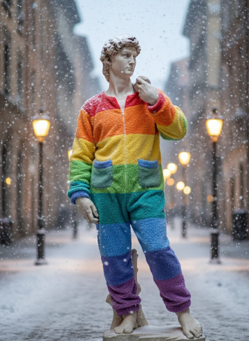 复古街景中,古典石雕穿彩虹睡衣,拟人化超现实趣味,面料质感与石刻风交融,梦幻雪夜点亮节日奇想。