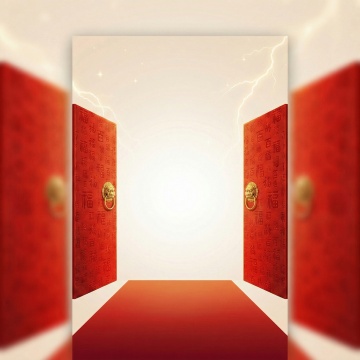 红底金边中式门形构图,3D浮雕大字“开工大吉”配金属门环,融合古典纹样与现代质感,喜庆祥瑞,寓意新年开门红。