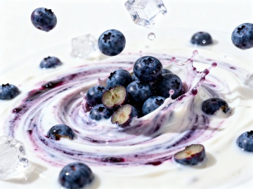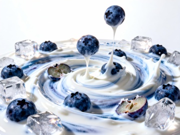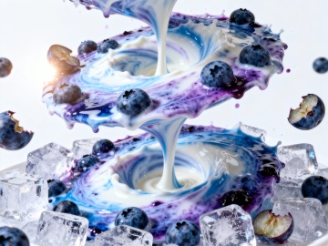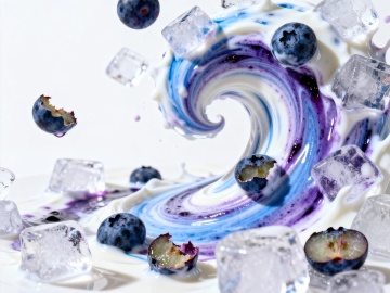 3D液态风设计,清新蓝莓汁瓶置于水中,自然背景衬托,展现夏日清凉感。
