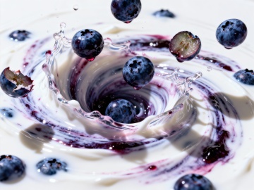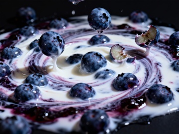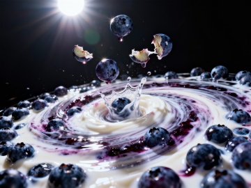 超写实风格的蓝莓背景,深蓝色调为主,点缀水珠的光泽与水花四溅的动态效果,几颗饱满的蓝莓悬浮于半空,底部是盛满蓝莓的玻璃碗,周围环绕着晶莹的水滴和几片翠绿的叶子,背景带有朦胧的光斑,整体营造出清新、水润且富有生命力的氛围,光影层次分明,细节质感细腻,水珠的透明感和蓝莓的紫黑色泽形成鲜明对比,构图饱满且富有动感,适合作为具有自然清新设计感的背景使用。