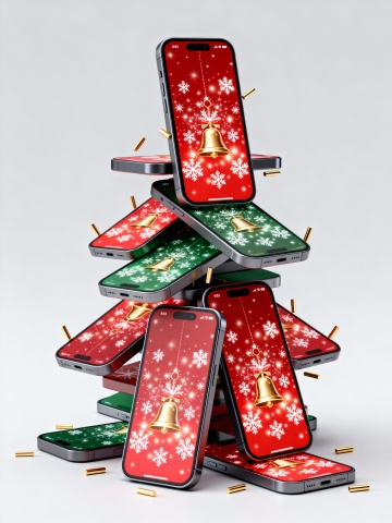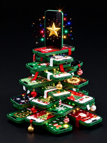 几何风玻璃圣诞树,融合红绿金三色晶透切面,3D立体结构闪耀奢华感,重拟物设计呈现清透质感与喜庆氛围,顶部星饰点亮节日光芒。