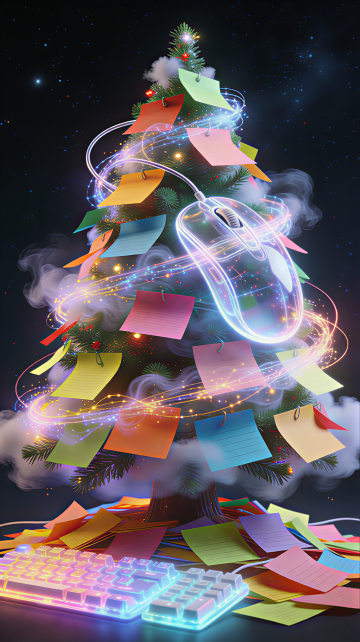 赛博朋克风圣诞树,霓虹灯缠绕,3D玻璃质感鼠标悬浮,粒子光效流动,键盘发光,未来科技与节日梦幻交织。