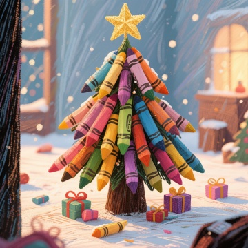 3D厚涂风圣诞树,彩漆流淌如油画,挂满画笔与几何装饰,夜空星月映衬,闪耀“Merry Christmas”字样,梦幻喜庆,趣味十足。