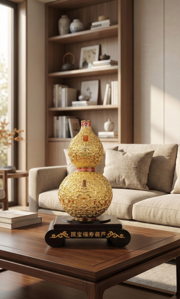 主体置于胡桃木色圆桌上,旁边有几本堆叠的古风书籍,背景是摆放着绿植、博古架和新中式沙发的客厅,整体以新中式暖色调为主