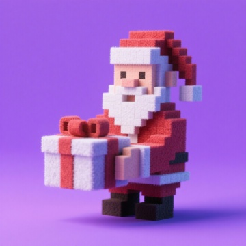 像素风3D圣诞老人手持礼物,毛发生长质感,卡通感十足,紫色背景烘托喜庆节日氛围。