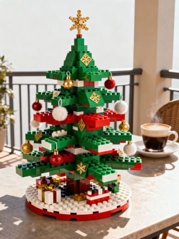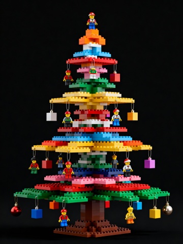 3D积木圣诞树,融合卡通与微缩艺术,拼贴式色彩堆叠,塑料质感鲜明,挂饰人物趣味十足,洋溢喜庆节日氛围。