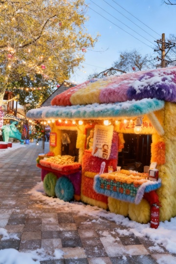 毛发生长风与轻拟物风结合,彩虹毛绒小摊萌趣十足,国潮元素点缀,雪中灯火映衬喜庆温馨,梦幻卡通感扑面而来。