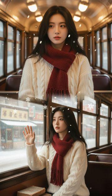 雪地中的温柔身影,胶片风与实景感交织,光影柔和,营造出浪漫唯美的冬日氛围,轻拟物设计点缀细节,传递静谧而温暖的文艺情调。