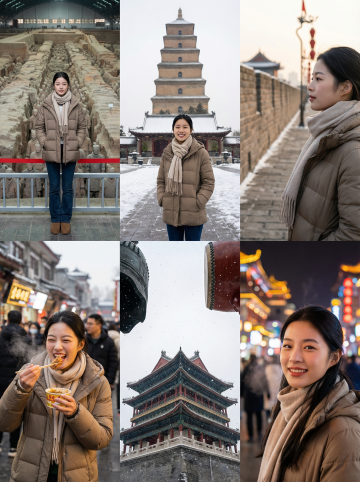 生成一个由9种不同镜头拍摄的“电影联系表”形式的九宫格旅行图,不要有明显分界线,拍摄的是参考图这一拍摄对象在初雪的首尔旅游,阳光洒落,色调温暖,不同景别、视角或动作。