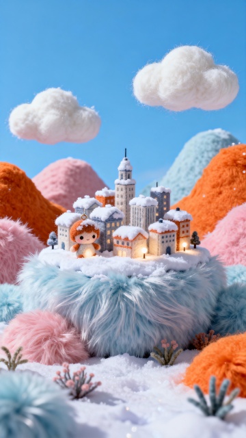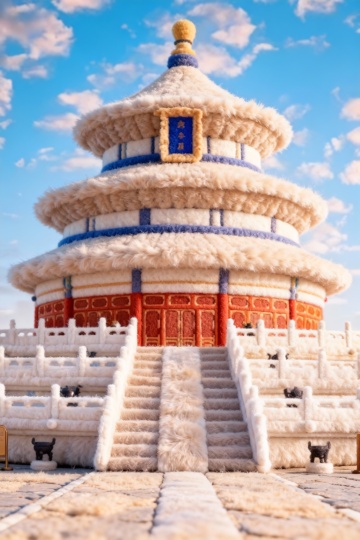 以 “柔绒混搭地标” 为核心灵感:选取布达拉宫这一标志性建筑为主体,保留其红白建筑的辨识度,同时用蓬松雪绒覆于建筑檐角、街巷,搭配毛绒质感的云朵与花坛,让庄重的世界文化遗产融入软萌的童话肌理;街巷中行人、拍照者的存在,既添生活烟火气,又以 “现实人物 + 柔绒场景” 的反差,模糊现实与梦境的边界 —— 用柔软纤维消解地标建筑的肃穆感,织就一场 “神圣地标落进暖糯童话” 的奇幻碰撞,每一处绒感细节都