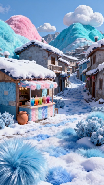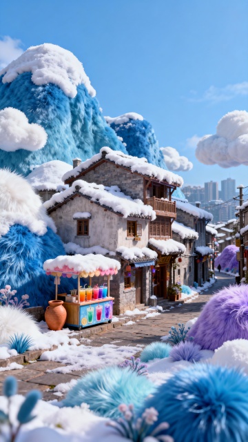 以 “绒化冬日乡野” 为核心,用毛绒质感重构传统村落:将青瓦民居、街边小摊裹上蓬松雪绒,让山石、植被化作蓝紫渐变色的柔绒团簇,背景叠入现代楼宇的朦胧轮廓,既保留乡野街巷的烟火气(彩罐、摊位),又以柔软纤维消解冬日的冷寂,用 “现实场景 + 毛绒材质” 的混搭,织就一场 “暖糯旧时光撞见轻科幻” 的温柔梦境,每一处绒感细节都在打破现实与童话的边界