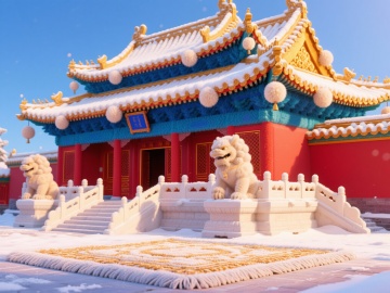 梦幻雪境中的中式宫殿,3D微缩艺术风格,鎏金屋檐与毛发生长般绒雪交织,静谧唯美的虚拟自然画卷。