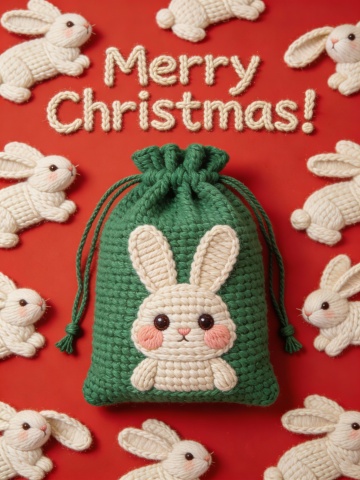 刺绣风毛线兔袋,可爱卡通造型,手工编织质感,轻拟物设计,红色背景衬托喜庆圣诞氛围。