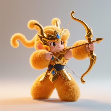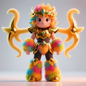 圣斗士金牛座,毛绒绒的质感,穿着金色的圣衣,牛角粗壮,表情坚毅,站姿威武,周围有柔和的光晕,整体风格可爱又不失力量感