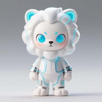 未来感与科技感融合的软3D卡通狮子,拟人化设计搭配金属风细节,蓝光点缀,萌趣十足。