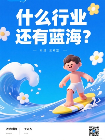 清新软3D风,卡通男孩冲浪,蓝色背景配小白花,夏日清凉感十足。