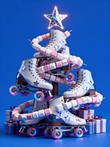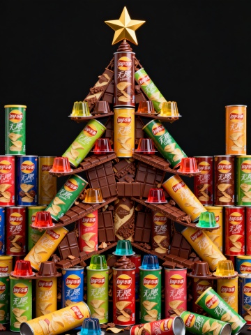 薯条堆叠成圣诞树,鎏金星顶点缀彩灯,微缩艺术风融合波普色彩,金属质感与重拟物设计交织,喜庆趣味感十足。