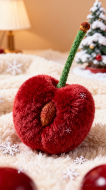 将车厘子变成毛绒绒质感,放在米白色毛绒毯上(点缀雪花装饰),背景为台灯、积雪圣诞树摆件。高清图片,中间水果缩小一点