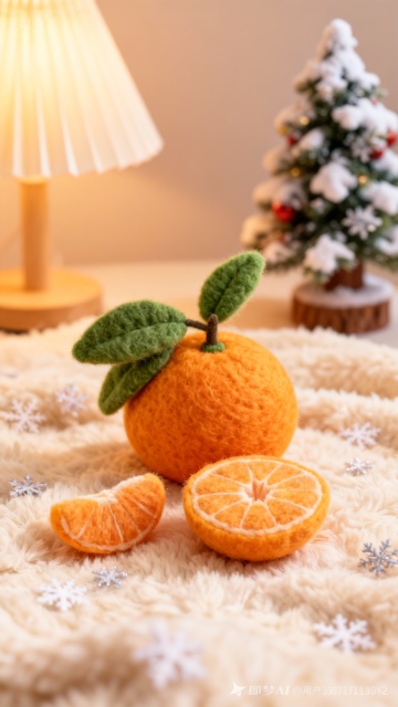温暖灯光下,毛绒质感的橙子与雪景圣诞树相映,微缩艺术风搭配粘土风细节,营造出温馨、可爱、柔软的节日氛围。