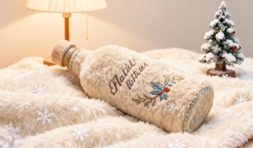 放在米白色毛绒毯上的瓶身有精致刺绣文字与图案(点缀雪花装饰),背景为台灯、积雪圣诞树摆件。