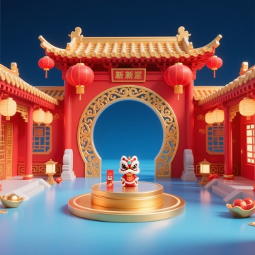 软3D国潮风,卡通人物与舞狮互动,喜庆红灯高挂,庙会入口热闹非凡,粘土质感细腻生动。