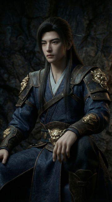 东方科幻风格人物插画,主体是一位身着蓝色西服的角色,场景设定为神秘的灵幻空间,现代科幻题材,细腻渲染,清冷的蓝色为主色调,暗黑色内搭,金色装饰点缀,幽谧又神秘的氛围,正面特写视角,突出人物的神态与服饰细节,发丝间有蓝色挑染,眼尾有红色妆容,手部流转蓝色光效,衣摆和袖口有纹理,背景中飘散荧光粒子,奇幻质感与东方美学