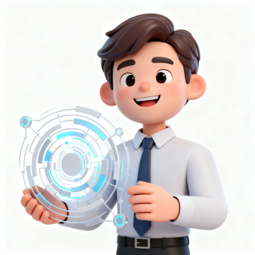 软3D风格商务人物,手持未来感科技界面,玻璃质感透明圆环设计,融合虚拟现实元素,展现科技与商务的完美结合。