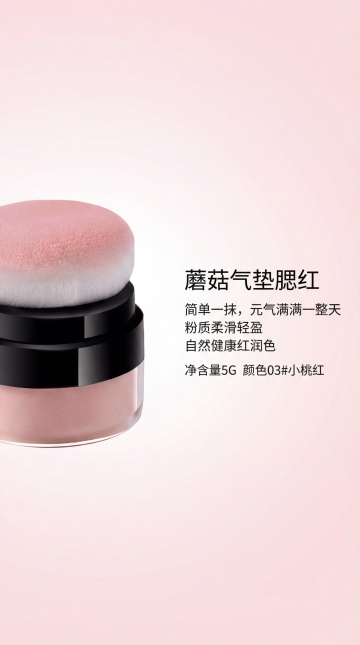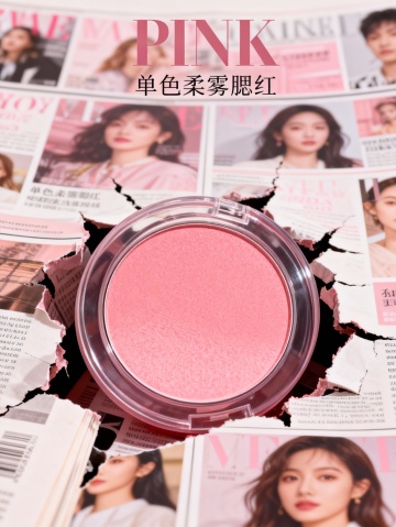 撕纸风拼贴杂志感,柔和粉调腮红轻盈绽放,清透雾面质感呼应时尚美学,营造高级柔美氛围。