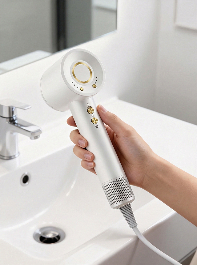1:1 比例,专业电商产品摄影,轻奢高级个护风,主体为浅香槟金色高速负离子电吹风,严格还原产品外观、配色、结构、按键、进风口细节等所有细节,产品外观必须完全一致,不得改变设计、配色或结构元素,保持产品的真实材质质感:机身的哑光金属质感、按键的细腻触感、进风口的金属网格工艺。电吹风直立放置在米白色岩板浴室台面上,背景是极简轻奢的卫浴空间,搭配藤条香薰、透明玻璃花瓶绿植、壁挂镜等软装,整体光影采用柔和的漫反射自然光,营造温馨精致的居家氛围,传递高端舒适的护发生活方式,画面构图居中对称,视觉焦点完全集中在吹风机上,无多余杂物,色调温暖高级,细节清晰锐利,符合高端个护家电的视觉调性。负面词:模糊、变形、色彩偏差、产品细节缺失、材质失真、配色错误、结构变形、背景杂乱、强光直射、阴影过重、多余杂物、水印、非同款产品、卡通化、像素过低、过度修图、虚假质感、比例失调、画面拥挤、曝光过度、曝光不足、纹理缺失、产品破损、logo 错误、反光过度、场景违和、人物干扰、画面抖动、色差严重详情