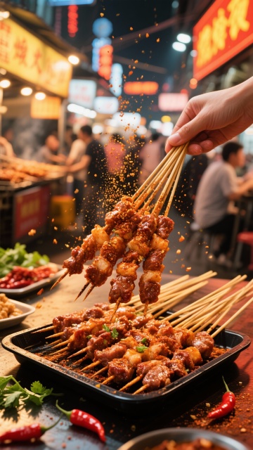 特写镜头下的羊肉串,鲜嫩多汁的肉块肥瘦相间,串在竹签上,正放在金属烤架上炙烤,熊熊火焰从烤架下窜起,舔舐着肉串,肉的表面被烤得金黄焦香,滋滋冒着油光,撒有芝麻和香料,白色的烟雾缭绕升腾,空气中弥漫着诱人的烤肉香气,背景是深色木质桌面,旁边摆放着盛有红色辣椒粉和绿色孜然粉的小碗,还有几颗八角点缀,整体画面色彩浓郁,光影对比强烈,营造出热烈、诱人的烧烤氛围,充满烟火气和食欲感。