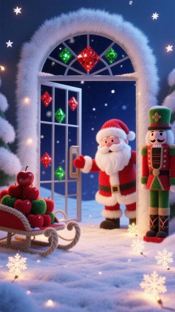 毛绒质感的圣诞树搭配3D微缩艺术风格,卡通化圣诞老人与驯鹿穿梭其间,彩球、礼物堆叠如毛线球,营造出温暖喜庆、趣味十足的节日氛围。