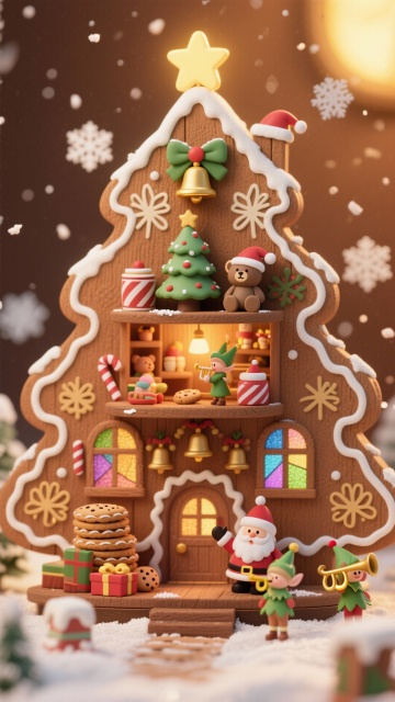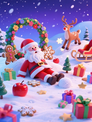 软3D风格圣诞夜景,一座以圣诞为造型的小屋,屋顶积雪,装饰有星星、圣诞球和彩灯,门口还摆放着一棵迷你圣诞树,屋内透出暖黄色灯光,周围有几棵装饰着雪花、星星的绿色圣诞树,巨型拐杖糖、堆叠的礼物盒点缀,圣诞老人坐车麋鹿车在天空中穿梭,背景是深蓝色夜空飘着雪花。