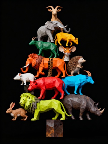 低多边形风格的几何动物群,色彩鲜明,金属质感与体积感交织,呈现未来科技与虚拟自然的酷炫融合。