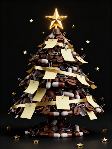 手工编织圣诞树,拼贴风与重拟物结合,色彩缤纷的绳线、纽扣与布片营造喜庆温馨氛围,3D混合材质展现极繁主义趣味感。