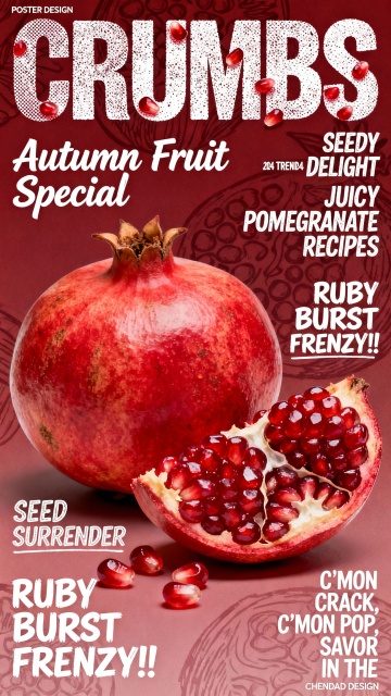 美食杂志封面,超大颗石榴,表皮红色,一颗剥开露出红宝石般籽粒,晶莹剔透,几粒籽散落,细节逼真。深红渐变底色带石榴纹路暗纹,布满手写风格文字:标题“CRUMBS”(字体粗犷有颗粒感,笔画带石榴籽点缀),栏目“Autumn Fruit Special”“SEEDY DELIGHT 2024 TRENDS”“JUICY POMEGRANATE RECIPES”“RUBY BURST FRENZY!!”,趣味短语“SEED SURRENDER”“C'MON CRACK, C'MON POP, SAVOR IN THE”。左上角小字“POSTER DESIGN”,右下角极小字“CHENDAD DESIGN”。整体风格活泼随性,手绘字体与真实石榴摄影结合,充满生活气息与美食趣味。保留丝网印质感,半调图案,噪点颗粒,线条简洁灵动,极繁主义,色彩鲜明饱满。