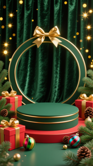画面中心是墨绿色的圆柱形展台,展台被积雪环绕,周围是迷你圣诞小屋(屋顶覆雪、屋内透出暖光)、装饰好的小圣诞树、包装精美的礼盒,背景还有虚化的暖光光斑,空中仿佛飘着细雪,以深绿、暖棕、雪白为主色调,搭配暖黄灯光,整体色彩柔和且温暖