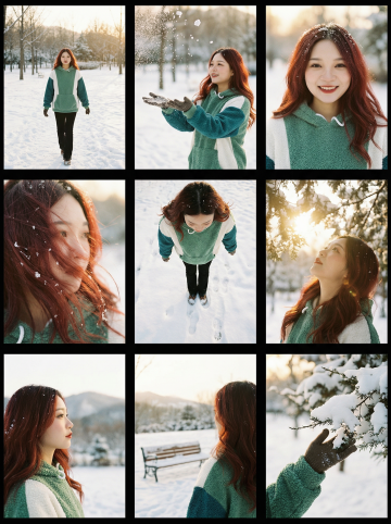 生成一个由9种不同镜头拍摄的“电影联系表”形式的九宫格,不要有明显分界线,拍摄的是参考图这一拍摄对象在冬日雪景公园散步,阳光洒落,色调温暖,不同景别、视角或动作。